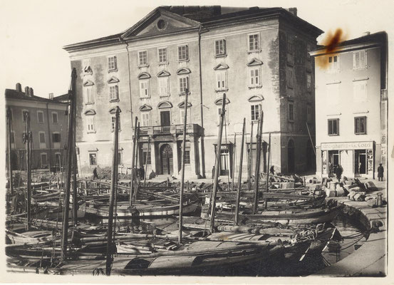 Il porto piccolo con le batele dei pescatori sullo sfondo Palazzo Trevisini, Pirano 1920