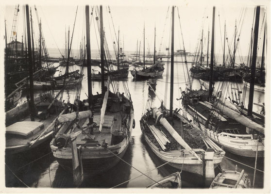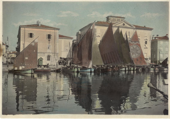 Bragozzi davanti alla pescheria e al Palazzo della Guardia di finanza, Pirano 1920