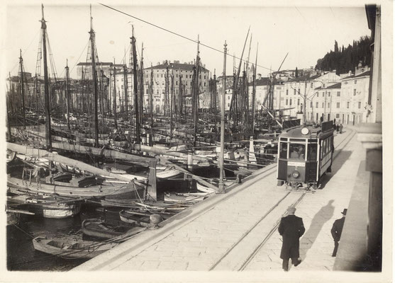 Il porto con sullo sfondo il postale che lascia l'ormeggio, Pirano 1920