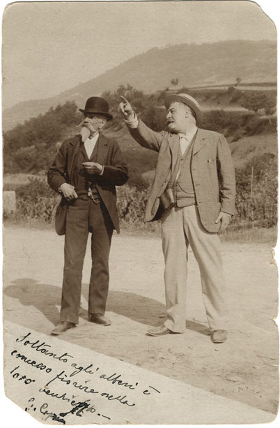 Nella cartolina di corrispondenza Giuseppe Caprin e Giuseppe Savorgnani suo amico pittore sono fotografati dal cartografo che li accompagna nelle esplorazioni del territorio mentre i due sono intenti a discutere.