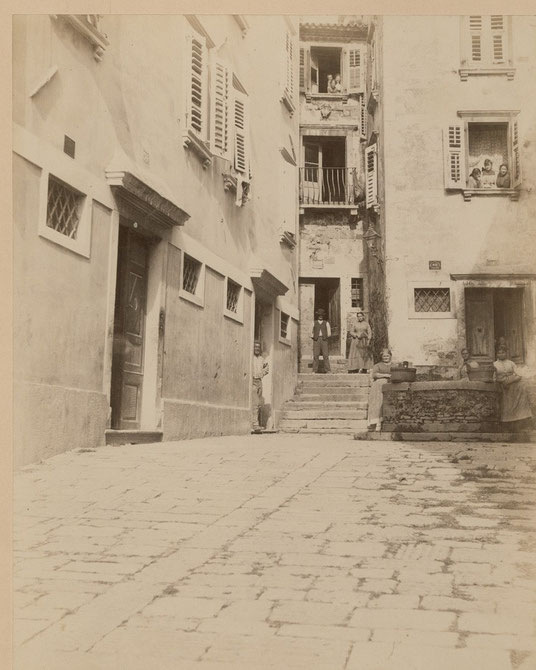 Da sin: Casa dei Besenghi degli Ughi, Il mandracchio. Pescatori isolani Isola d'Istria, ante 1889.