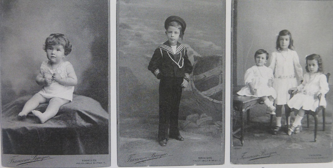 Francesco Benque con i figli Alba, Ernst, Alberto ritratti in studio nel 1877 a Trieste.