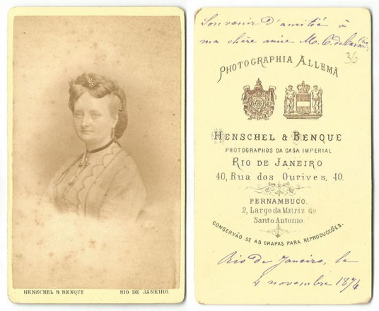 La prima carte de visite con il ritratto di donna riporta sul verso il logo dello studio e la data apposta dalla dedicataria, Rio de Janeiro 1874.