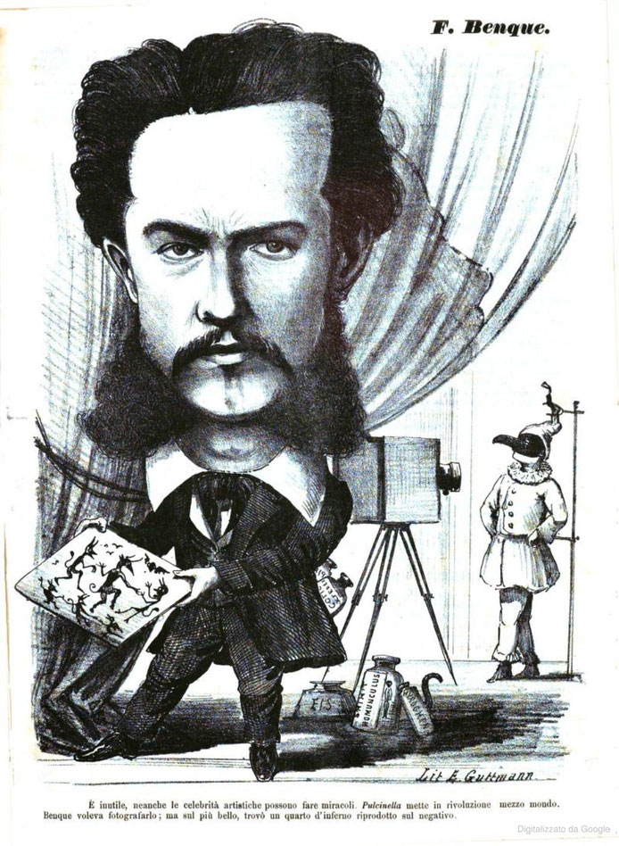 Lo stesso periodico il 14 gennaio 1865 pubblica un suo grande ritratto caricaturale con una criptica didascalia che cito letteralmente: "E' inutile neanche le celebrità artistiche possono fare miracoli. Pulcinella mette in rivoluzione mezzo mondo. Benque voleva fotografarlo; ma sul più bello trovò un quarto d'inferno riprodotto sul negativo."