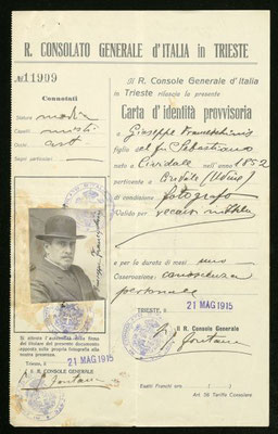 Scopriamo sulla sua carta d'identità provvisoria rilasciata nel 1915 e conservata presso l'Archivio di stato di Trieste che è nato nel 1852 precisamente il 12 febbraio e che la sua professione è fotografo.
