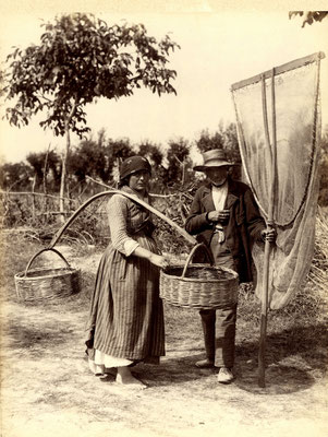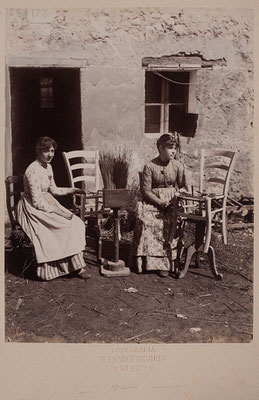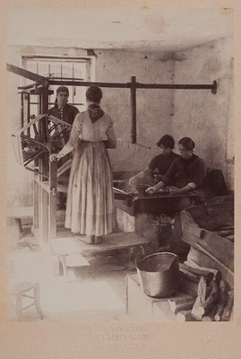 Donne che lavorano: filandere cioè operaie specializzate nella lavorazione dei bozzoli di bachi da seta all'interno delle filande, impagliatrici, coppia di popolani.