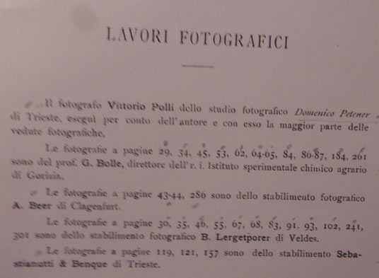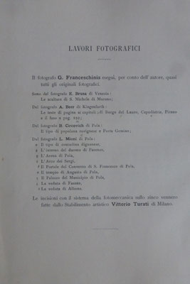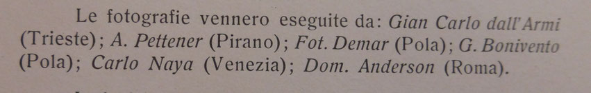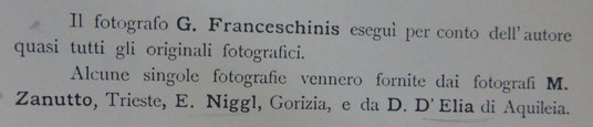 I fotografi sono elencati sotto la voce Lavori fotografici (p. 386): Il fotografo G. Franceschinis esegui', per conto dell'autore, quasi tutti gli originali fotografici, seguono i nomi degli altri fotografi: E. Brusa di Venezia, A. Beer di Klagenfurth, B. Circovich di Pola, L. Mioni di Pola.