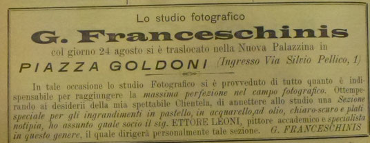 Si trasferisce quindi in Piazza Goldoni dal 24 agosto del 1904 con entrata in via Silvio Pellico n. 1 sino al 1914. La Guida scematica del 1904 spiega che: "Lo studio fotografico G. Franceschinis col giorno 24 agosto si è trasferito nella nuova palazzina in Piazza Goldoni (ingresso via Silvio Pellico 1). In tale occasione lo studio fotografico si è provveduto di tutto quanto è indispensabile per raggiungere la massima perfezione nel campo fotografico. Ottemperando ai desiderii della mia spettabile clientela di annettere allo studio una sezione speciale per gli ingrandimenti in pastello, in acquerello, ad olio, chiaro-scuro e platinotipia ho assunto quale socio il sig. Ettore Leoni (3) pittore accademico e specialista in questo genere il quale dirigerà personalmente tale sezione. Dal 1914 al 1915 risiede in via Risorta, 1".