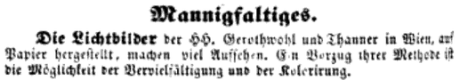 Negli anni seguenti i due ex pittori si presentano come soci sotto il nome di Gerothwohl & Tanner. Dapprima si stabiliscono a Vienna e si pubblicizzano sui giornali. Il 9 maggio compare tra i Wannigfaltiges [Vari avvenimenti] sul periodico edito a Vienna Der Sammler n. 74 [Il collezionista] l'avviso: "Le fotografie dei signori Gerothwohl e Thanner riprodotte su carta generano grande stupore. Il vantaggio di questo metodo è la possibilità diduplicazione e la colorazione".