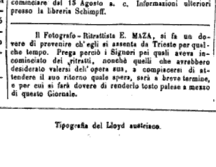 Per tutto il mese di luglio 1855 si ripetono gli avvisi nei quali Maza avverte che si allontana da Trieste per un certo periodo, su Il Diavoletto n. 191, 196, 197 (14, 19, 20 luglio 1855).